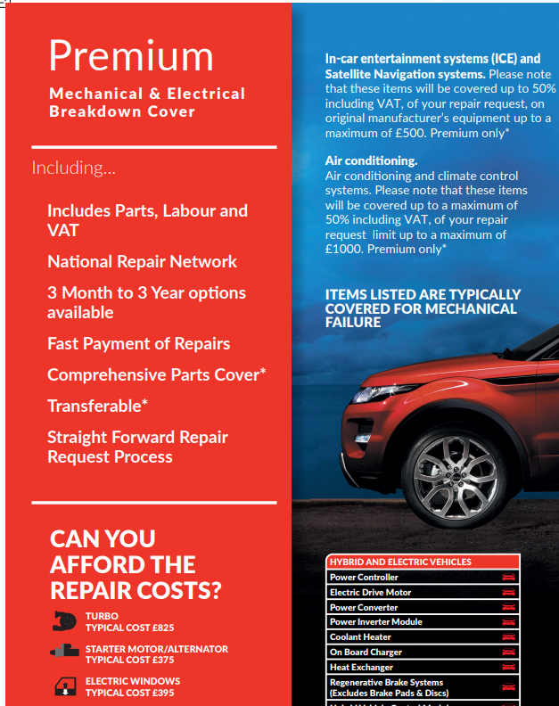 We have you covered with our comprehensive mechanical and electrical failure cover. In the unlikely event you experience a failure, you’ll be reassured to know you can take your vehicle to any VAT registered garage in the UK.